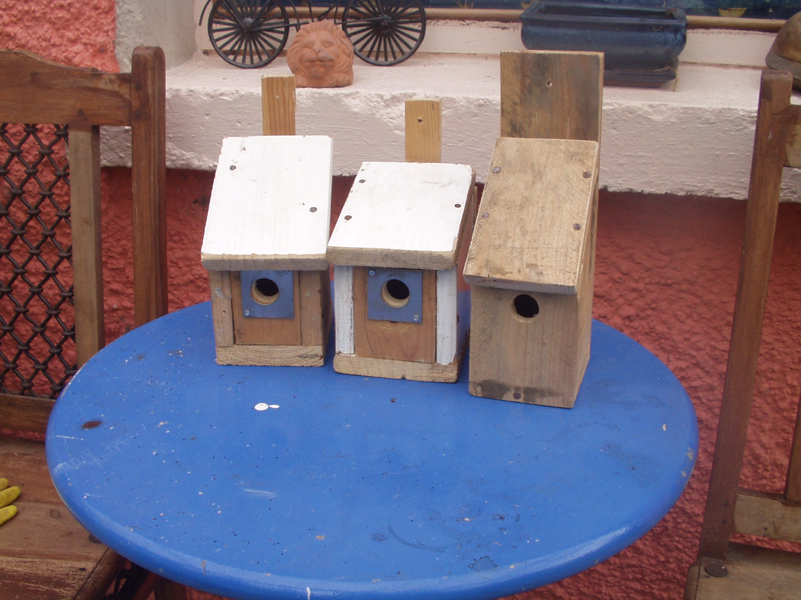 Bird boxes all made from bits of used wood and metal, a gift from a friend in a fair exchange.